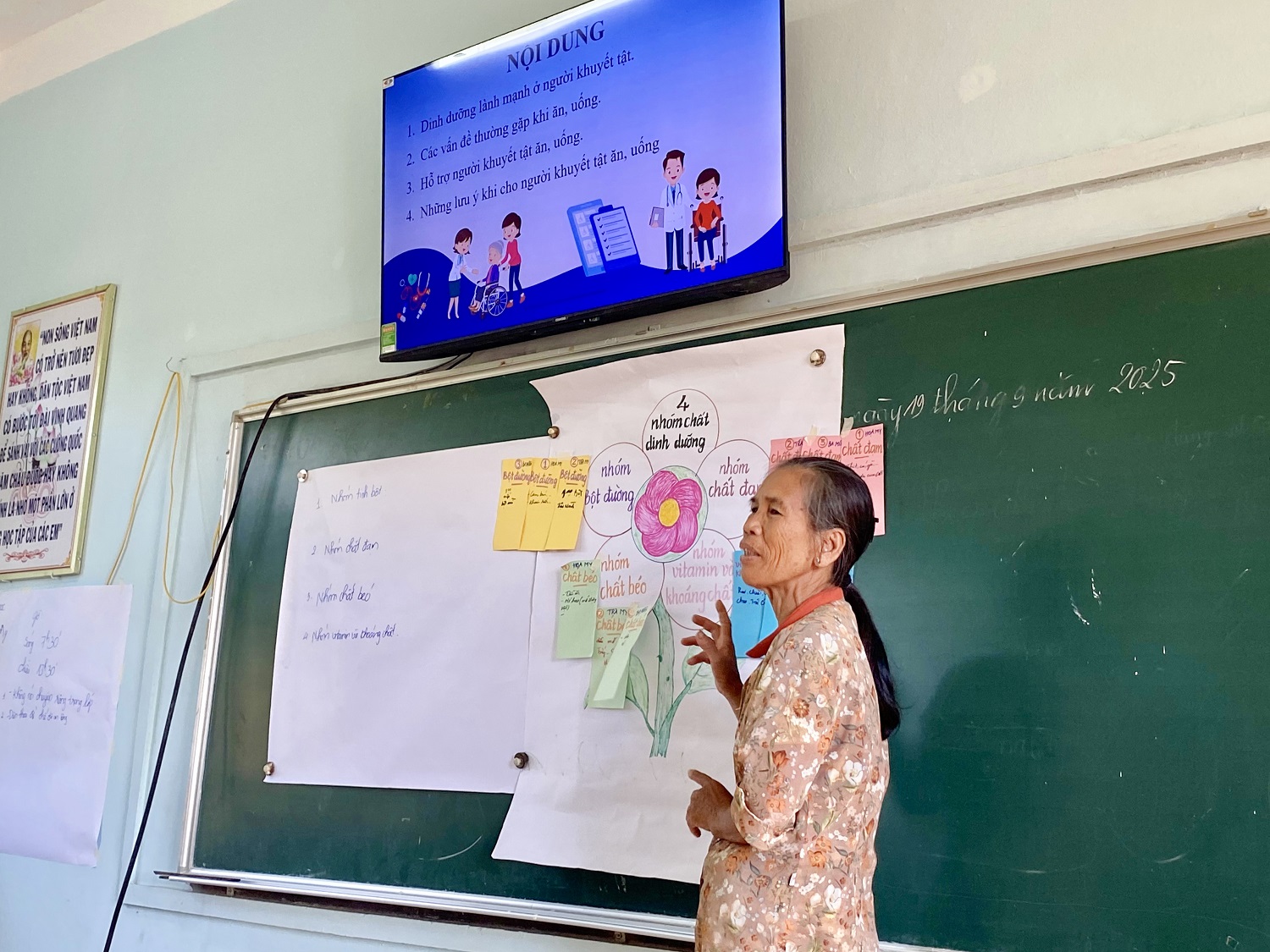 The program aimed to equip caregivers (mostly family members) with knowledge and skills to better care for persons with disabilities at home. The activity attracted 75 participants, who are direct caregivers such as spouses, parents, children, or siblings of persons with disabilities. In cases where persons with disabilities live alone or the primary caregivers in the family could not attend, relatives living nearby, such as uncles, aunts, or cousins, participated instead. The three classes were facilitated by medical staff from the Trieu Phong and Cam Lo District Health Centers. These trainers had been trained under the project on rehabilitation and caregiving and have worked in disability care since 2022.