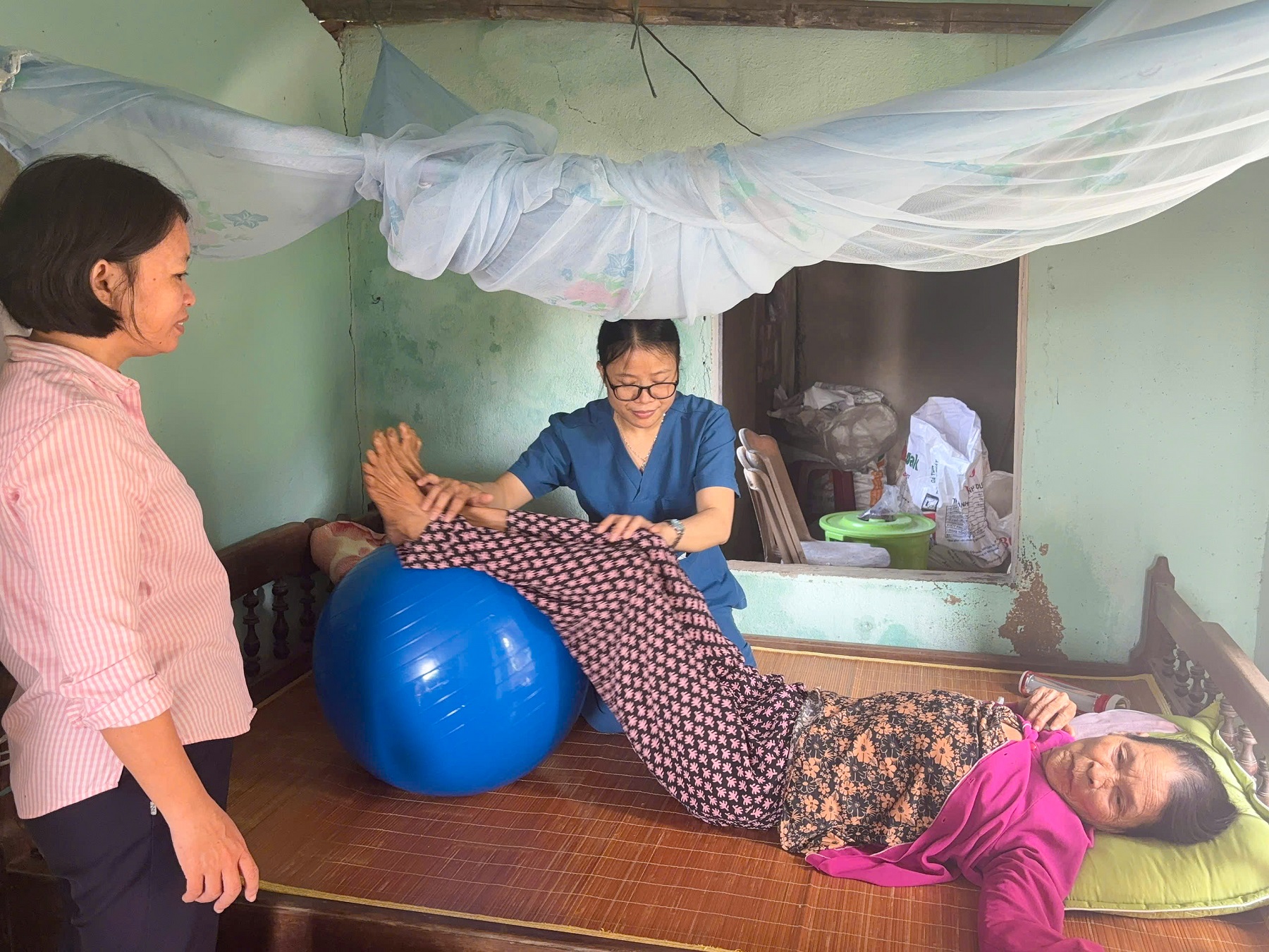 Dưới sự hướng dẫn của nhân viên y tế giúp người khuyết tật thực hiện bài tập phục hồi chức năng tại nhà và cải thiện khả năng vận động, nâng cao sức khỏe