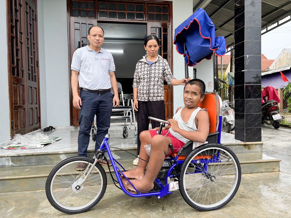 Người khuyết tật vui mừng nhận được xe lăn tay ba bánh hỗ trợ di chuyển trước sự chứng kiến của cán bộ kỹ thuật và người thân
