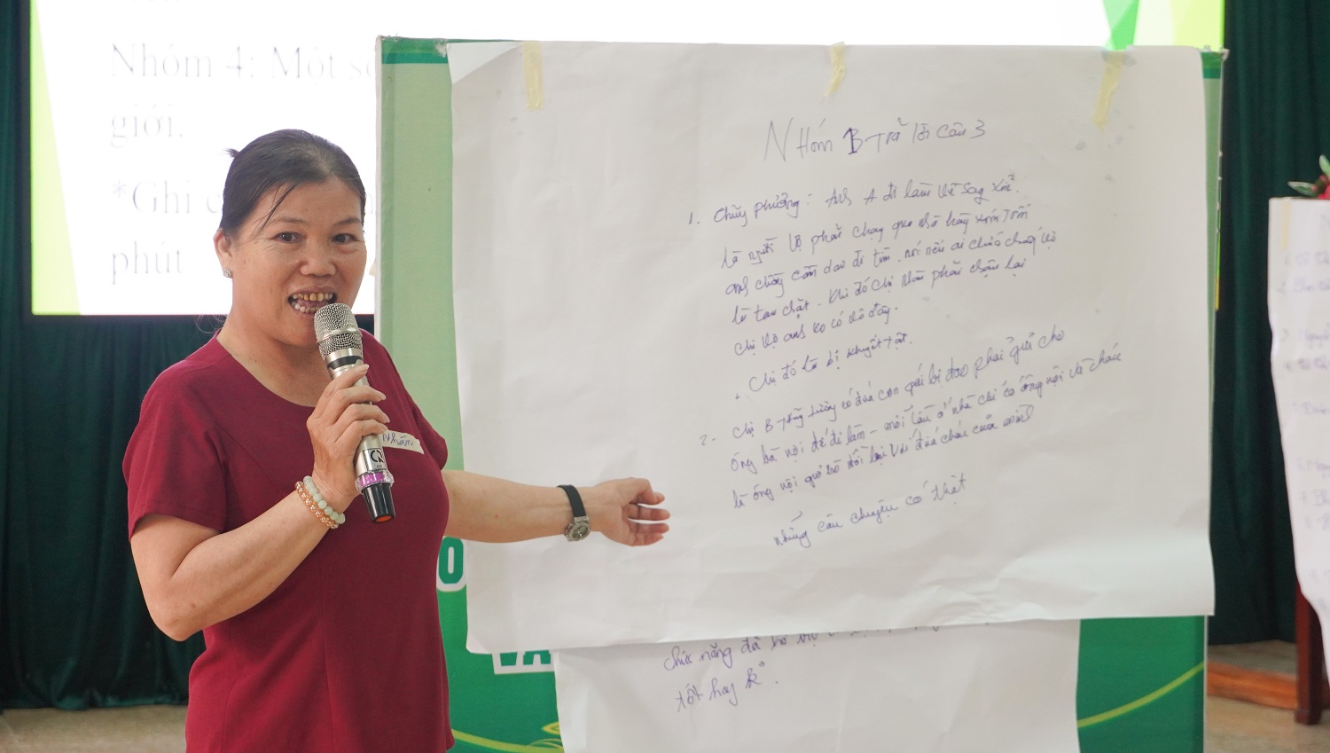 Một điểm nhấn đặc biệt của chương trình là việc giới thiệu các dịch vụ hỗ trợ cho người bị bạo lực giới tại địa phương, bao gồm các cơ sở tạm lánh và đường dây nóng liên hệ để nhận sự giúp đỡ kịp thời. Thông qua các phương pháp truyền tải đa dạng như trò chơi, thảo luận nhóm, đóng vai tình huống, xem video minh hoạ, buổi truyền thông đã tạo nên một không khí sôi nổi, gần gũi. Các phương pháp này không chỉ giúp người tham gia dễ dàng tiếp thu kiến thức mà còn khuyến khích họ chia sẻ câu chuyện, trao đổi kinh nghiệm và rèn luyện các kỹ năng ứng phó với những tình huống nguy cơ.
