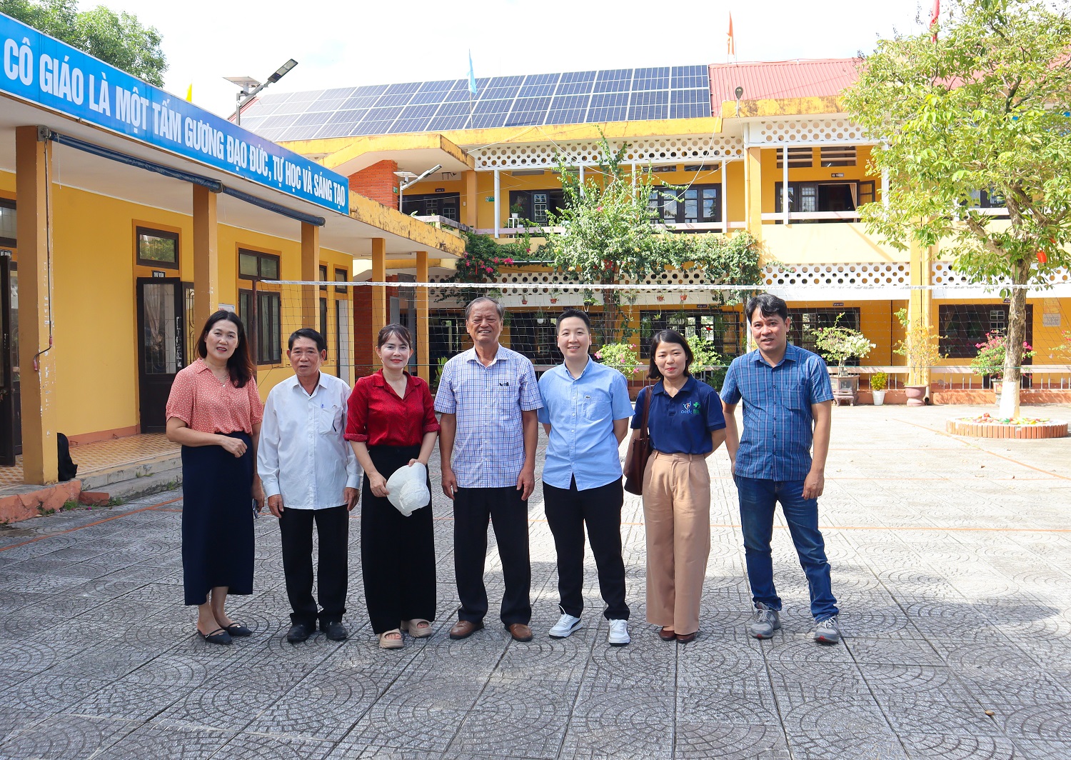Đại diện nhà trường và đoàn dự án chụp ảnh lưu niệm bên công trình điện mặt trời – bước tiến hướng tới ngôi trường xanh, tiết kiệm năng lượng